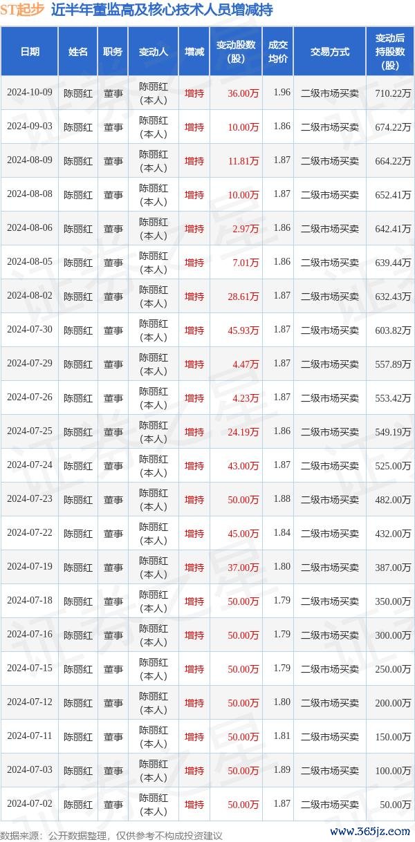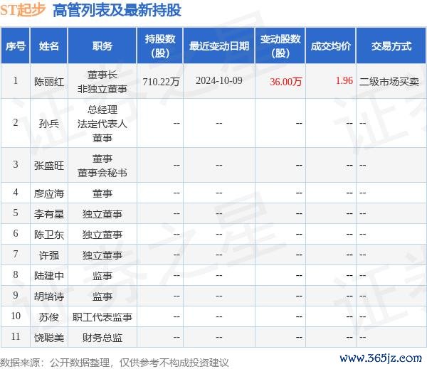 证券之星音问,字据10月11日商场公开信息、上市公司公告及交游所暴露数据整理,ST起步(603557)最新董监高及相关东谈主员股份变动情况:2024年10月9日公司董事陈丽红共增执公司股份36.0万股,占公司总股本为0.0668%。变动时期公司股价下落2.0%,10月9日当日收盘报1.96元。