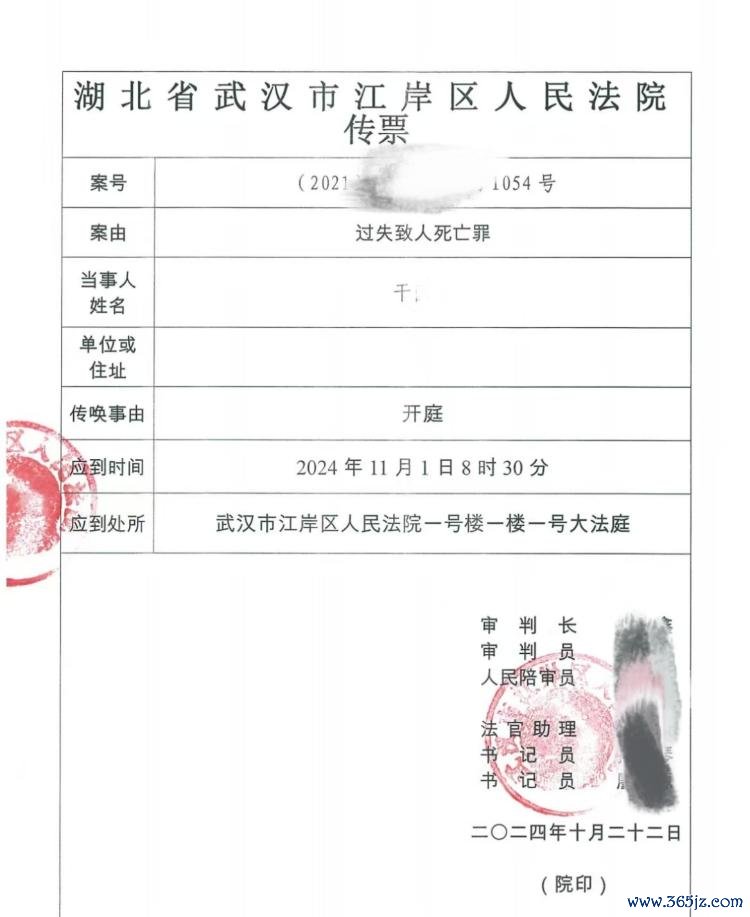 大皖新闻讯武汉女子干婷(假名)遭丈夫碾轧拖拽亏本案有了新音书。10月22日晚,死者父亲干先生告诉大皖新闻记者,该案将于11月1日在武汉市江岸区东谈主民法院一审开庭。大皖新闻记者从法院传票显现,该案案由是“邪恶致东谈主亏本罪”,开庭期间为11月1日上昼8点半。