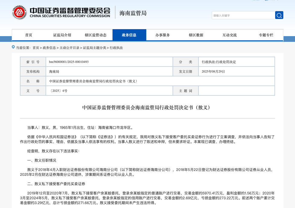 罚单显现,敖义2018年4月入职财达证券海南分公司,2018年5月22日,登记为财达证券的证券从业东说念主员,2025年2月在财达证券海南分公司退休,涉案时刻系证券公司从业东说念主员。